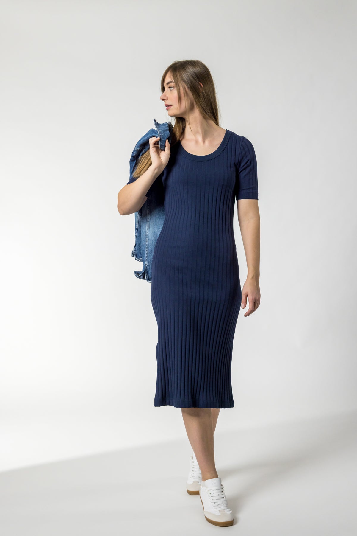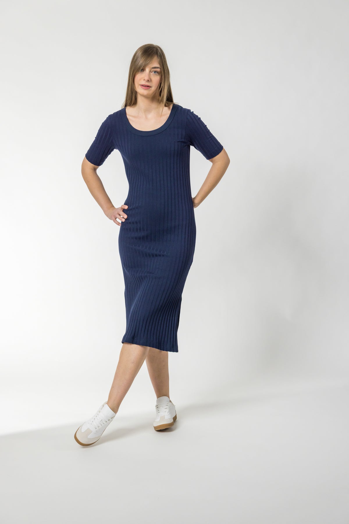 • Rundhals-Kleid mit 1/2 Arm und Schlitz am Bein