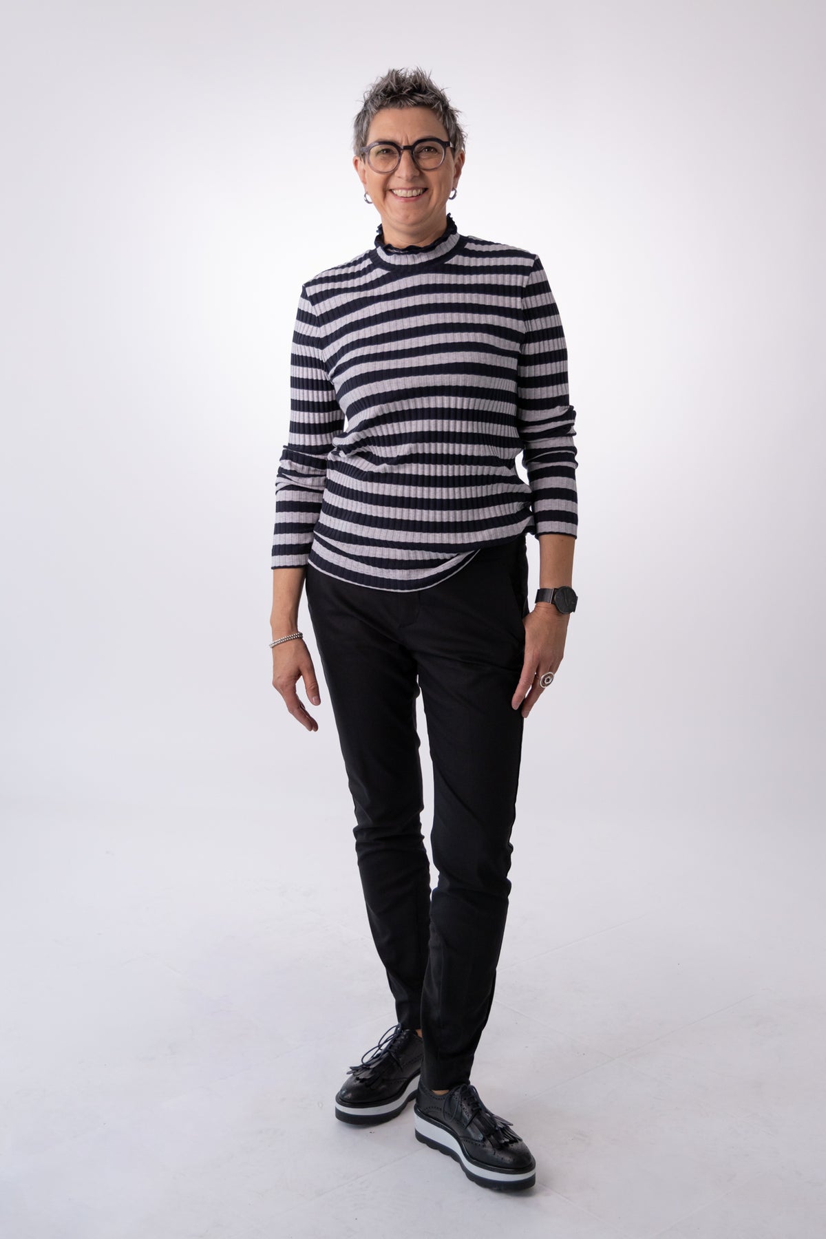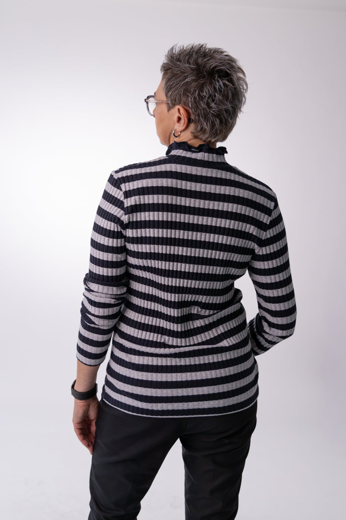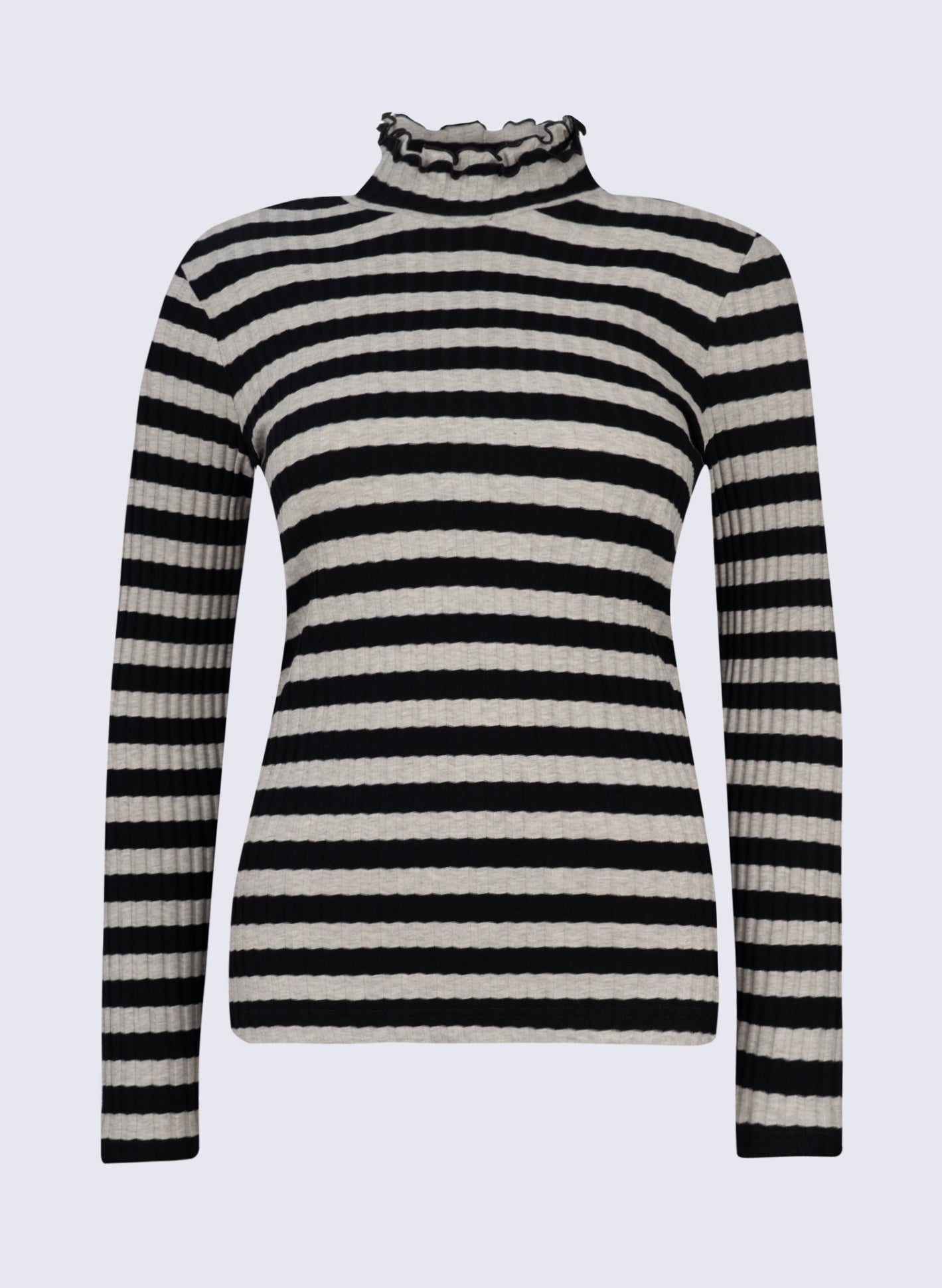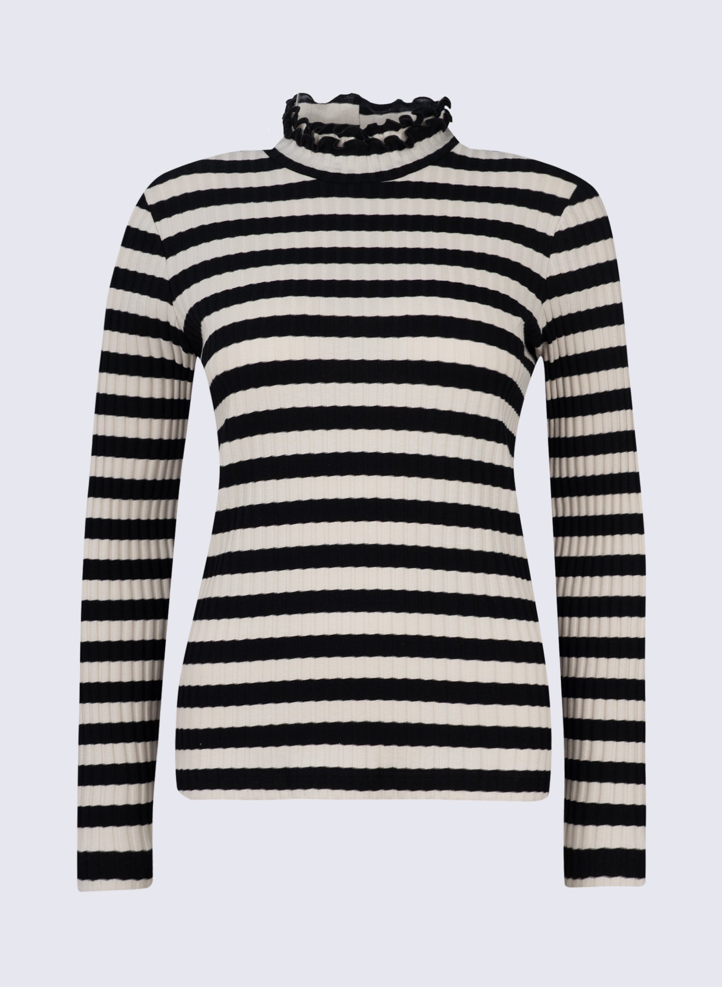 Ein Basic mit dem gewissen Etwas: Dieses Shirt aus weicher Baumwolle mit Elasthan überzeugt durch seine breite Rippenstruktur mit feinen Ringeln und einem liebevoll gearbeiteten, doppelt gelegten Stehbund mit zarter Rüschenkante. Der taillierte Schnitt schmeichelt der Figur, während der elastische Stoff für hohen Tragekomfort sorgt. Pflegeleicht, farbbrillant und absolut vielseitig – ein echtes Lieblingsteil, nicht nur bei uns im Team.