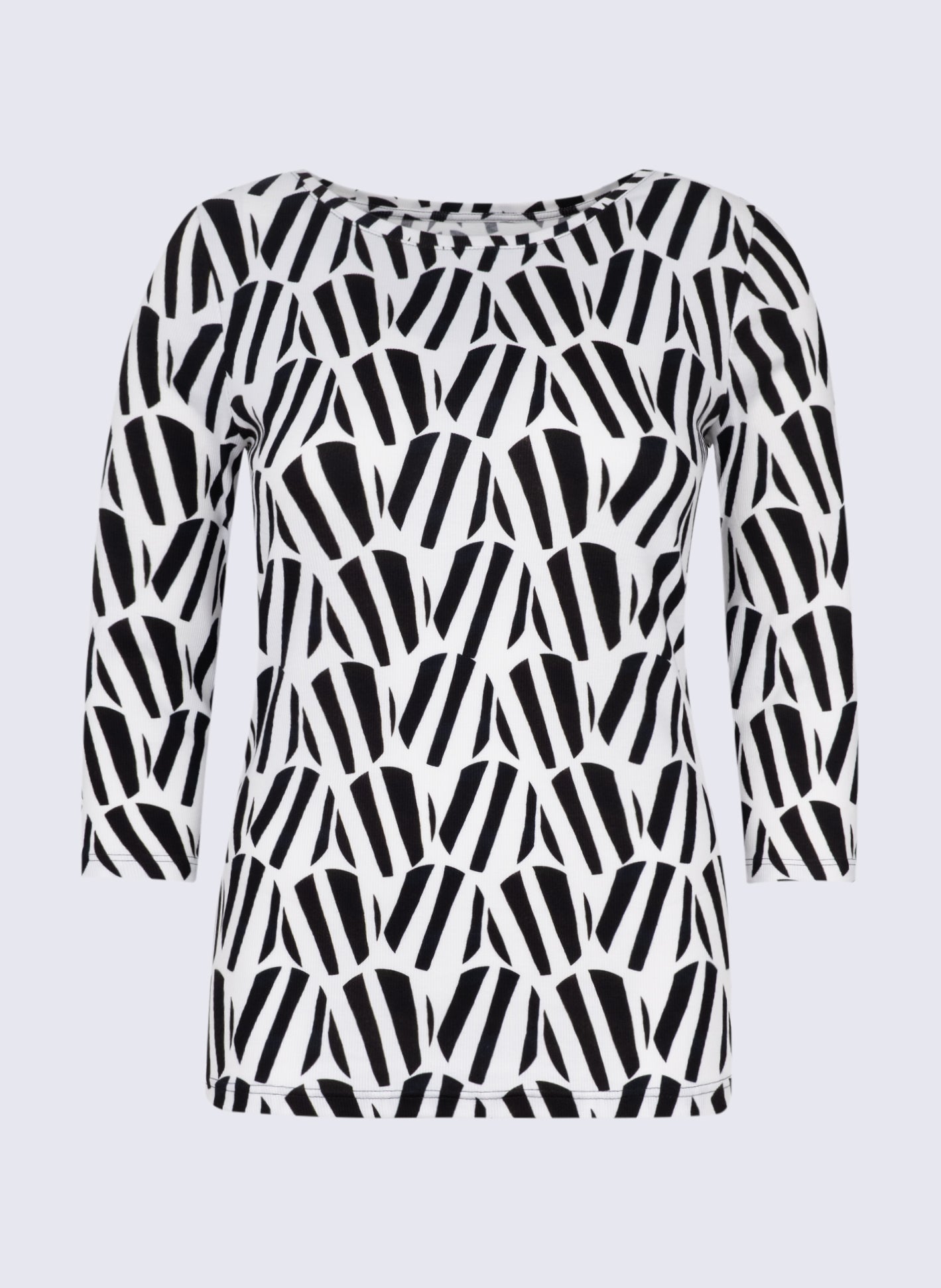Dieses Shirt in feiner Ripp-Optik und Allover-Print ist der perfekte Kombipartner zu Blazer und Strick. Auch nach vielen Wäschen bleibt das Shirt in Form und die Farben intensiv. Besonders in Schwarz-Weiß wirkt das Design modern und zeitlos zugleich – mal klassisch elegant, mal lässig kombiniert. Ein modisches Multitalent, das sich unkompliziert in jede Garderobe einfügt.